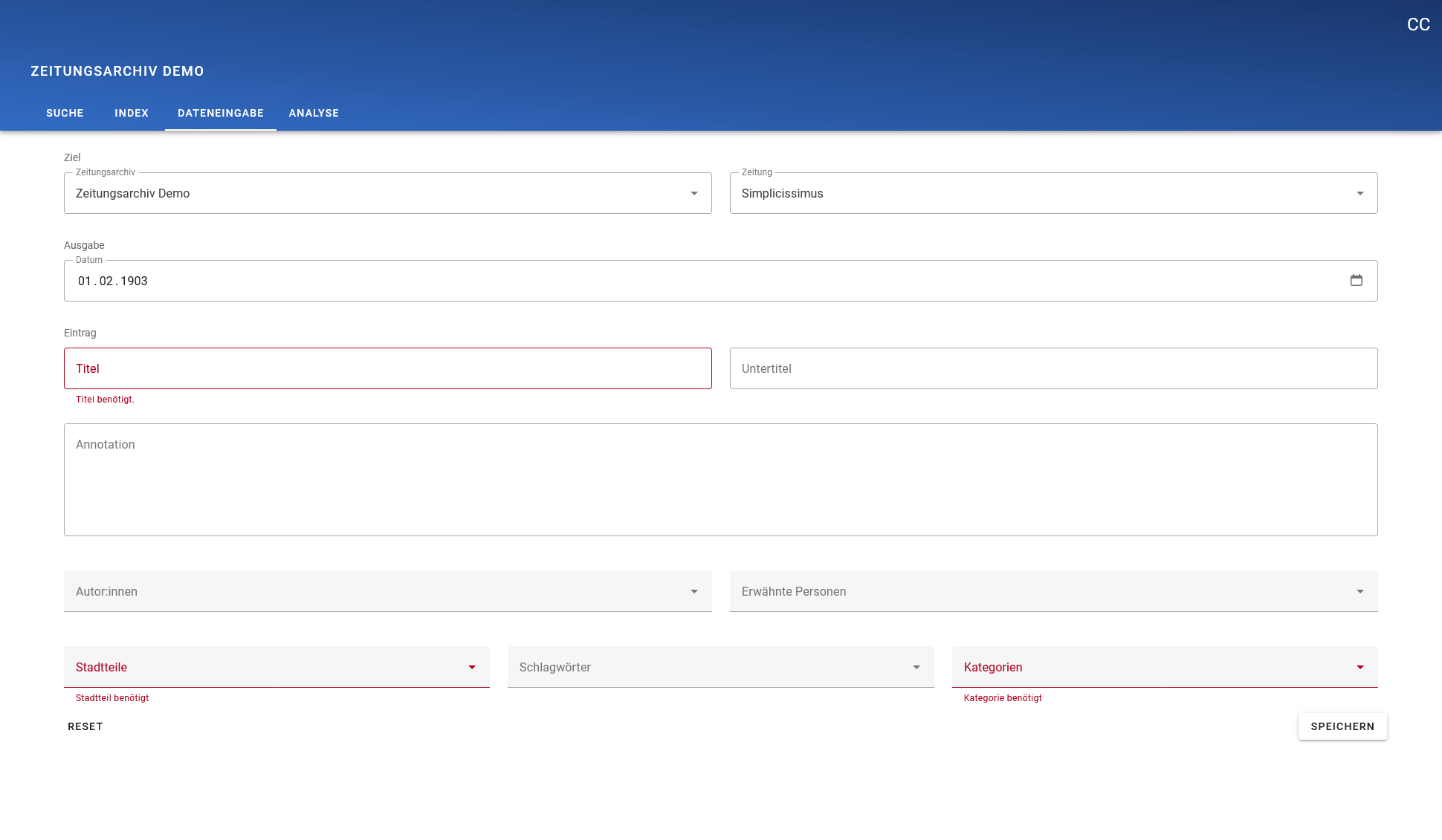 In der Fußzeile sind zwei Knöpfe: Ein Reset-Knopf, um die Eingabefelder zu leeren, und einen Speicherknopf, um einen Eintrag mit den eingegeben Werten hinzuzufügen. Beim Speichern wird überprüft, ob die Eingaben gültig sind, sind sie ungültig wird eine Fehlermeldung angezeigt und der Eintrag wird nicht hinzugefügt. Beim erfolgreichen Speichern wird eine Bestätigungsnachricht angezeigt und alle Felder bis auf das Zeitungsarchiv, die Zeitung und das Datum werden geleert.