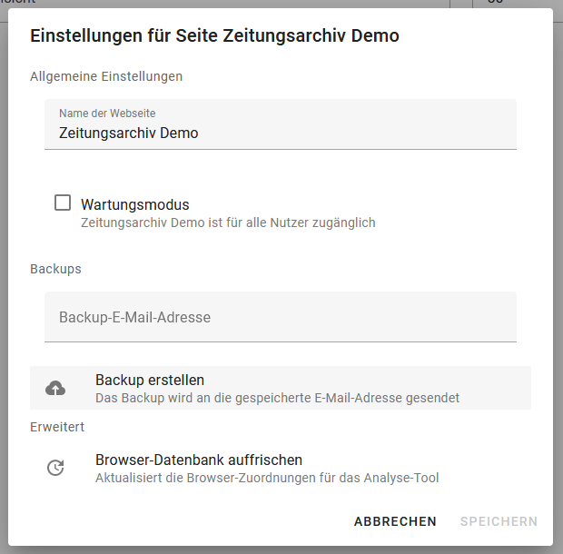 Das Zeitungsarchiv-System kann selbständig Backups erstellen. Dabei wird die gesamte Datenbank exportiert, sodass die Daten später ohne Einschränkungen wiederhergestellt werden können.
