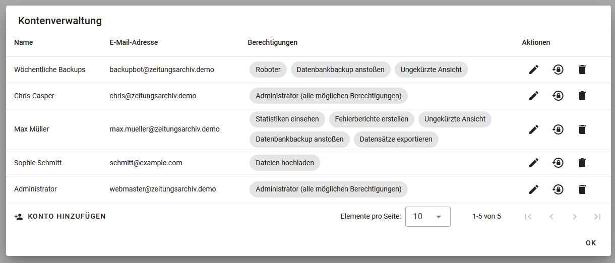 In dem Dialogfenster zur Kontenverwaltung werden die Konten tabellarisch aufgelistet. Für jedes Konto wird ein Name, eine E-Mail-Adresse, die Berechtigungen des Kontos und mögliche Aktionen angezeigt. Mit dem Stift kann das Konto in der Zeile bearbeitet werden, mit dem Schloss-Symbol kann das Passwort des Kontos zurückgesetzt werden und per Klick auf das Mülleimer-Symbol (und anschließender Bestätigung) wird das entsprechende Konto entfernt.